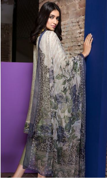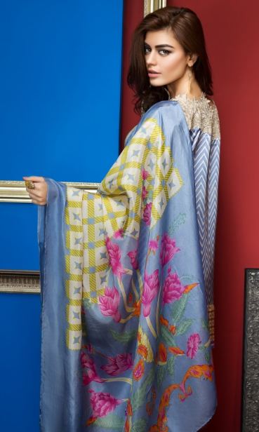 This is another amazing combination of colors and compatibility. It is priced at PKR 6,800; we believe another amazing addition to Volume-1 of Khaadi Lawn for this year. It is Printed Satin Front and Back. Embroidered Organza Patti, Lawn Shalwar, Tissue Silk Dupatta.